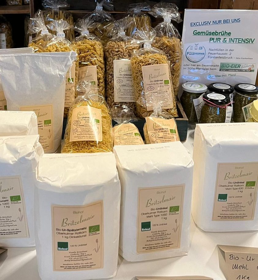Hildegard von Bingen schrieb: „Dinkel ist das beste Getreidekorn, es wirkt wärmend und fettend und sehr gut verdaulich.“ Aus eigenem Anbau von Familie Britzelmair ist der Bio-Urdinkel im Brucker Bauernmarkt als Korn, Grieß, Nudeln und in verschiedenen Mehl- Typen erhältlich.