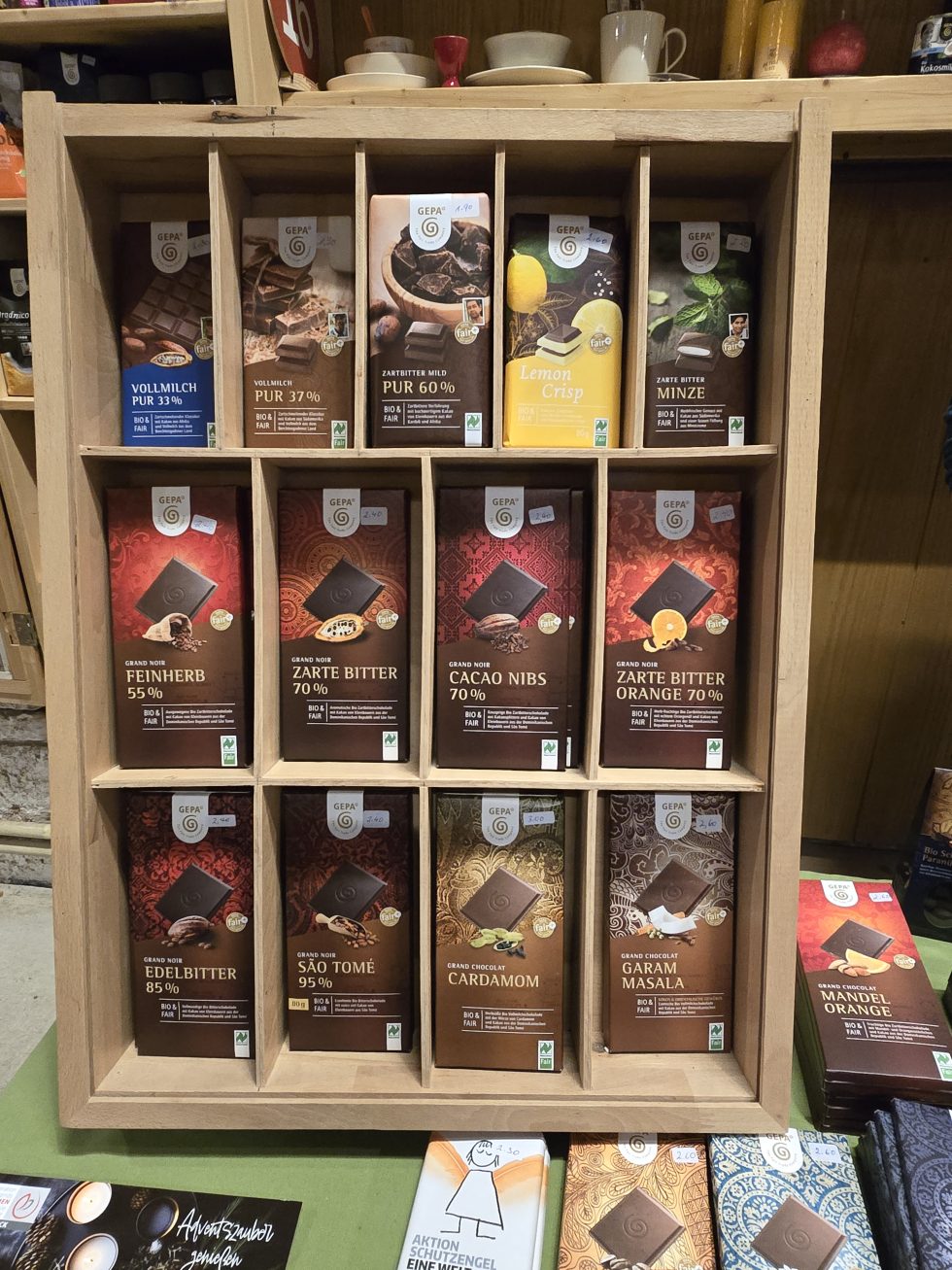 Schokolade, Kaffee, Tee, Reis, Couscous, Kekse, Trinkschokolade, Körbe, Taschen, Schmuck, Bücher, Schalen, Geschirr, Textilien