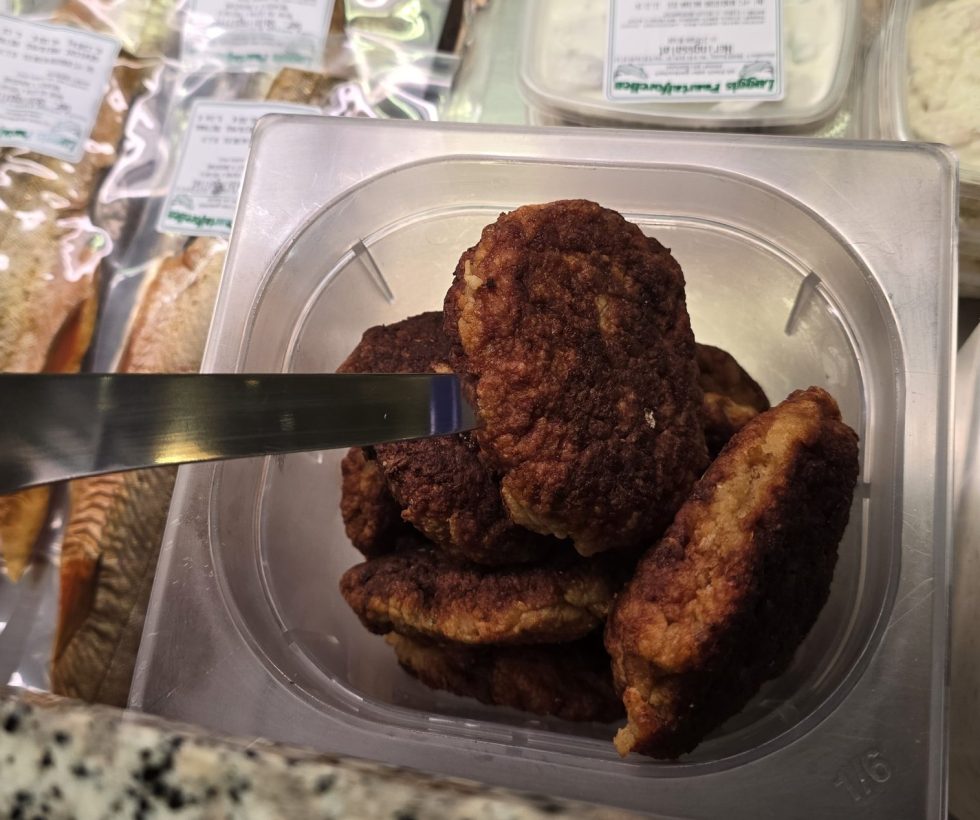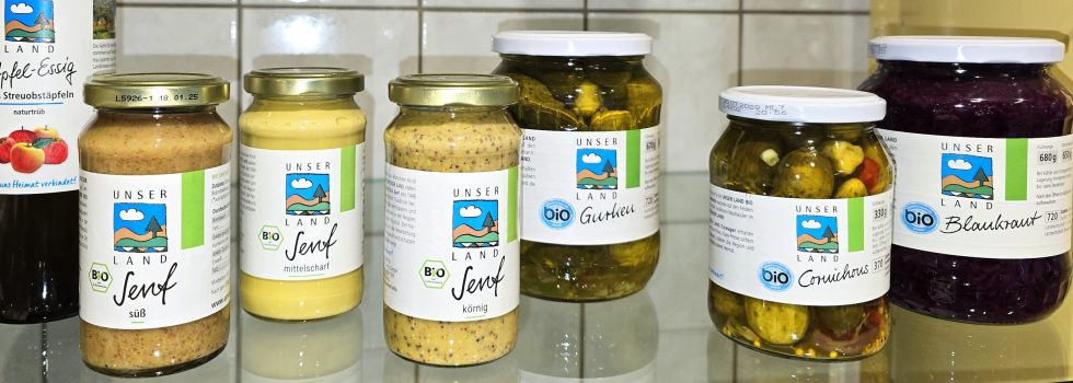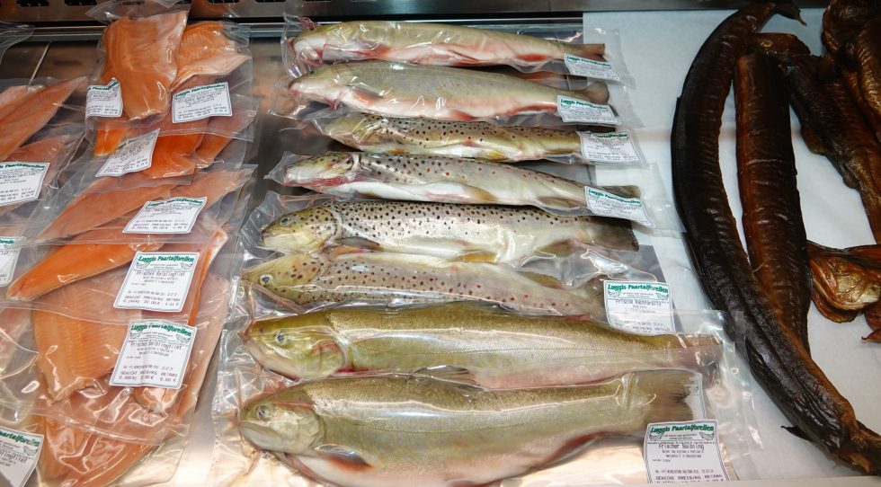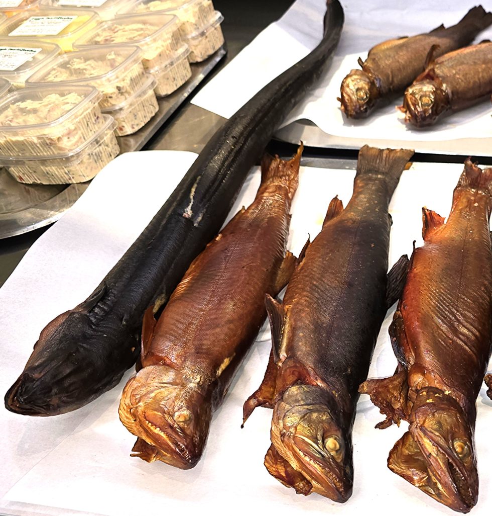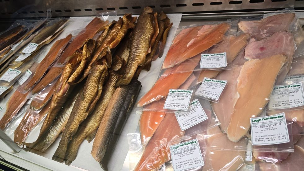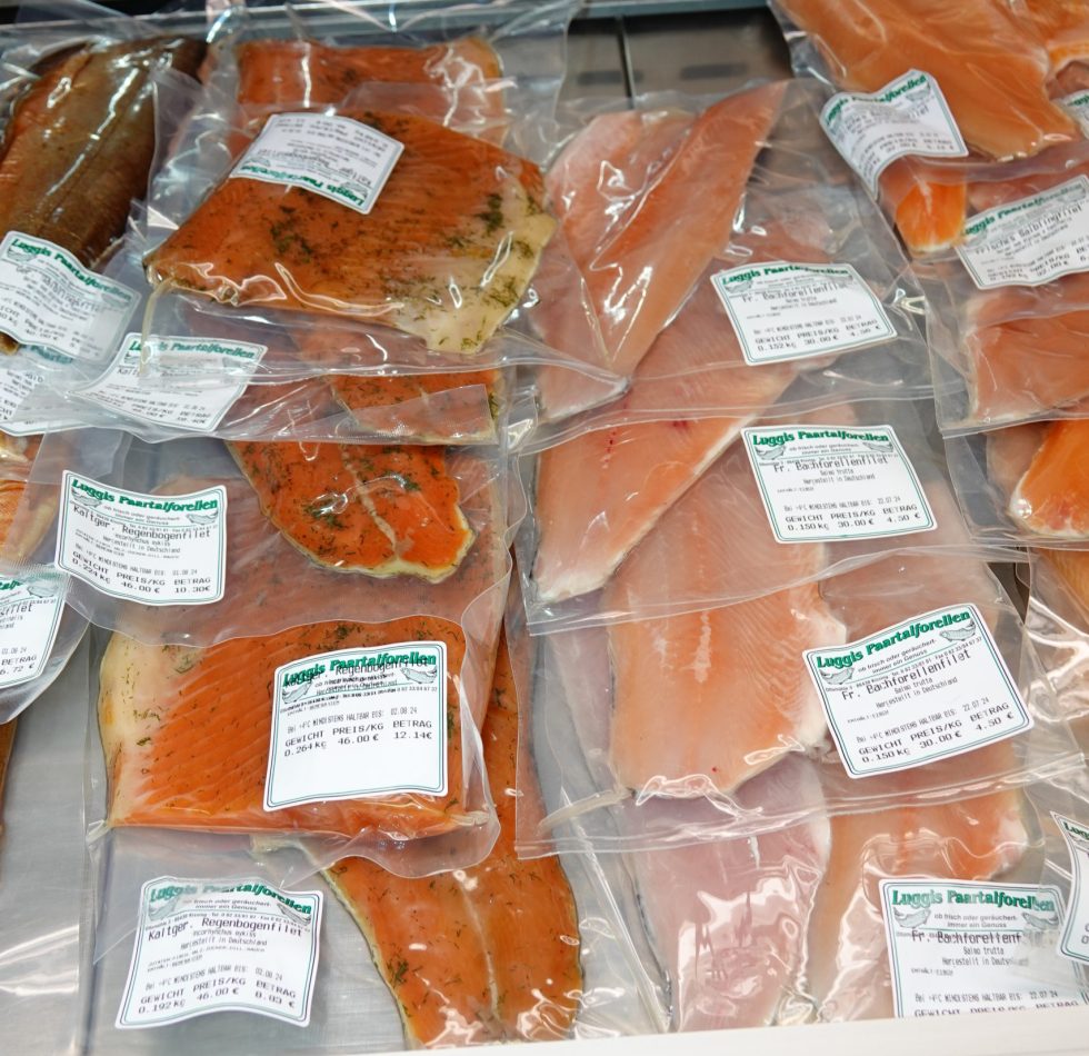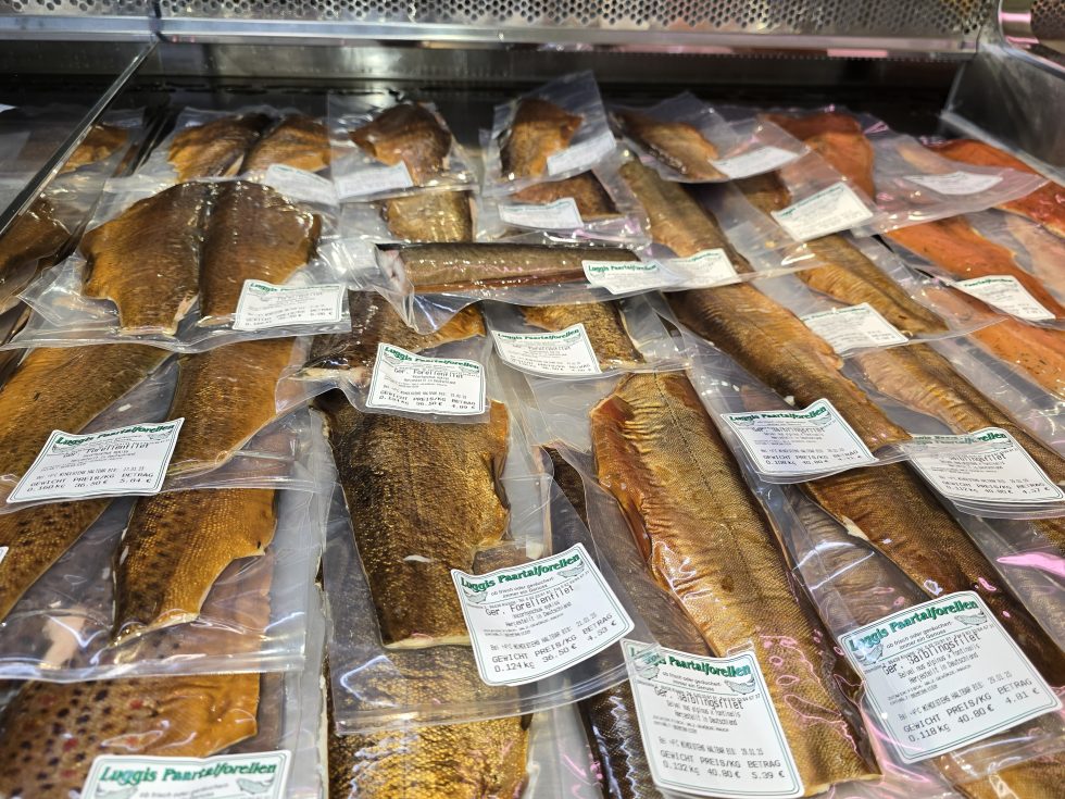 verschiedene delikate und hausgemachte Fischsalate, Forellenfilet nach Matjesart, geräucherter Aal (Wildfang vom Bodensee, eigene Räucherei), Käse- und Weinauswahl sowie Honig, Pesto, Soßen, Marmeladen und Teigwaren