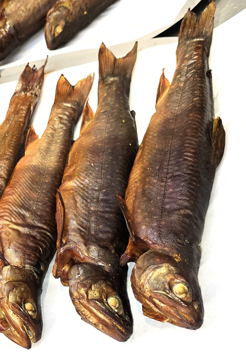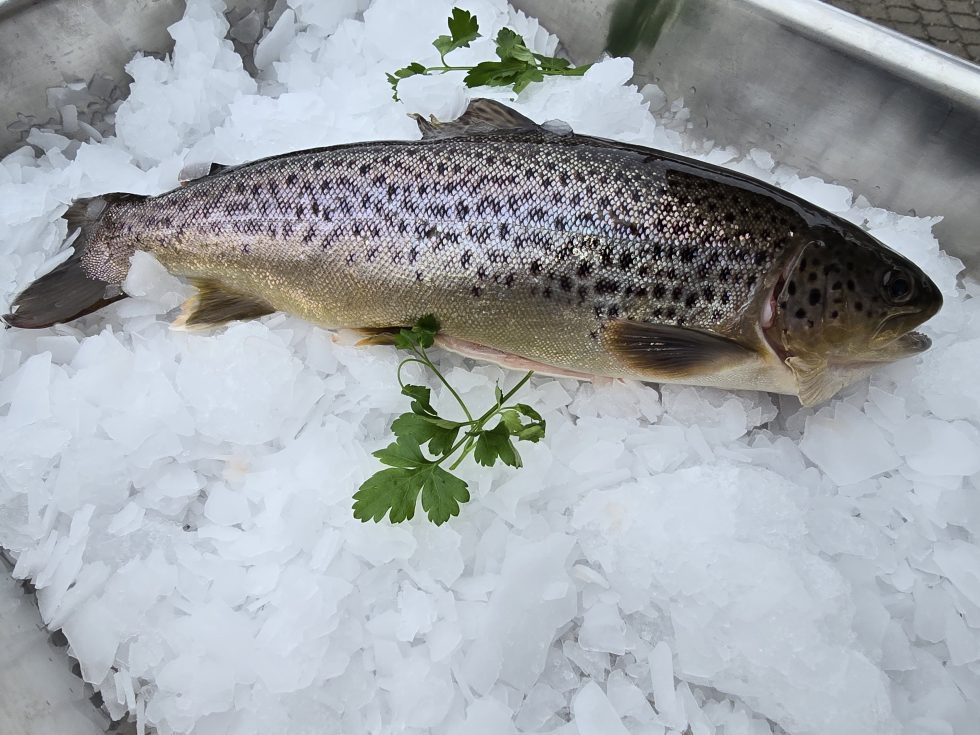 Frische und geräucherte Forellen aus eigenen Teichanlagen, Bachforellen, Karpfen (Sep.-Apr.), Saiblinge, kaltgeräucherte Lachsforellenfilets,