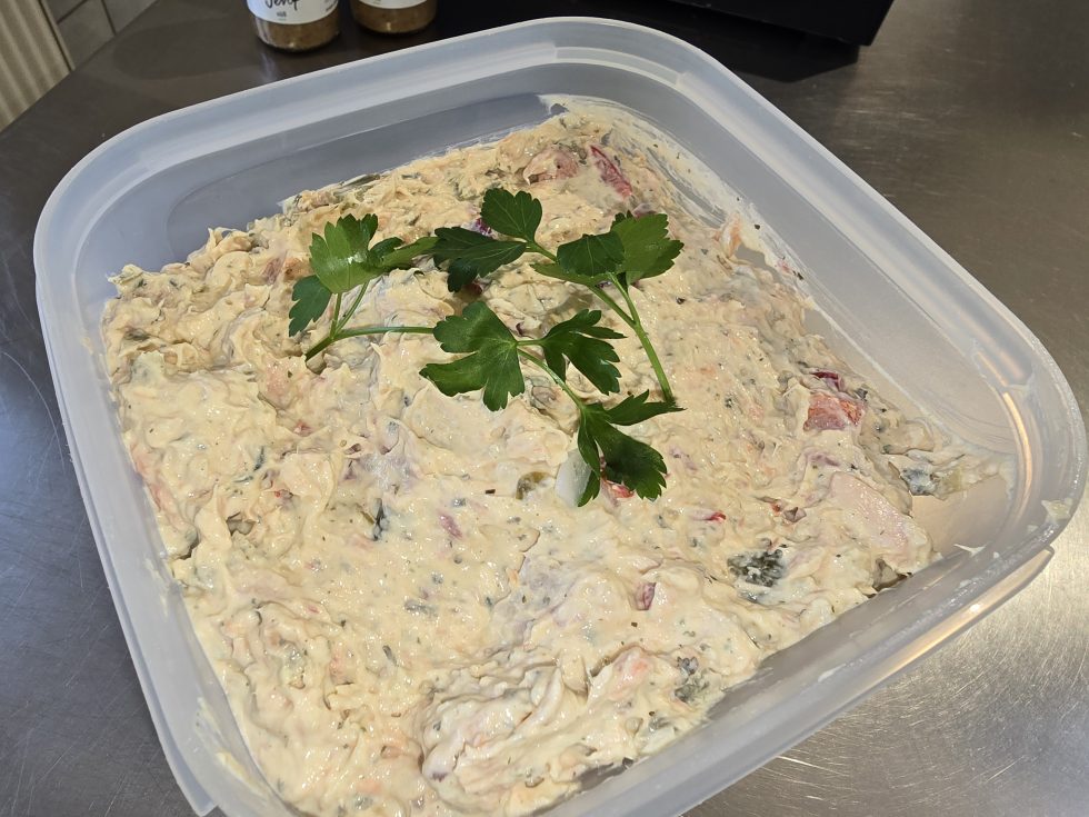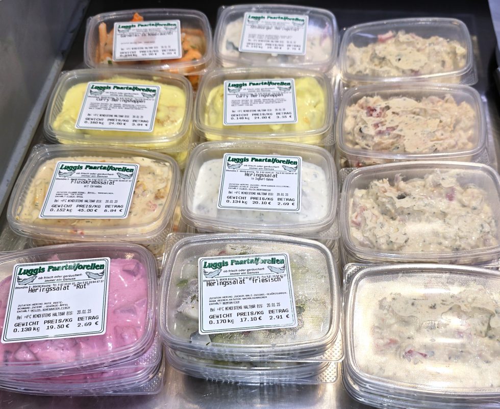 verschiedene delikate und hausgemachte Fischsalate, Forellenfilet nach Matjesart, geräucherter Aal (Wildfang vom Bodensee, eigene Räucherei), diverse Weißweine, Unser Land-Produkte passend zum Fisch