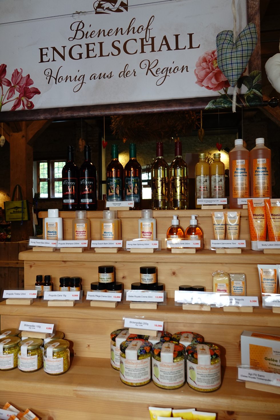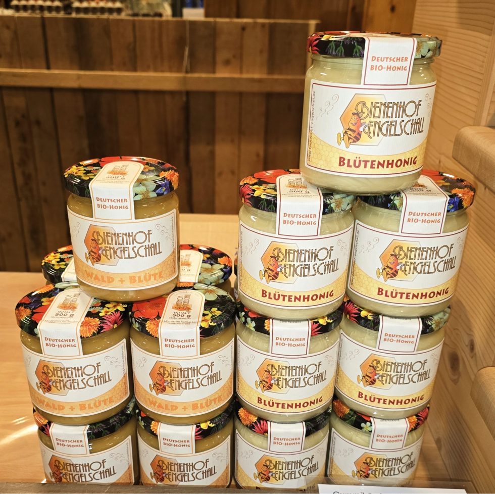 Verschiedene Bio-Honigsorten, Bienenwachskerzen, Honig-Met, Blütenpollen, Pflegeprodukte