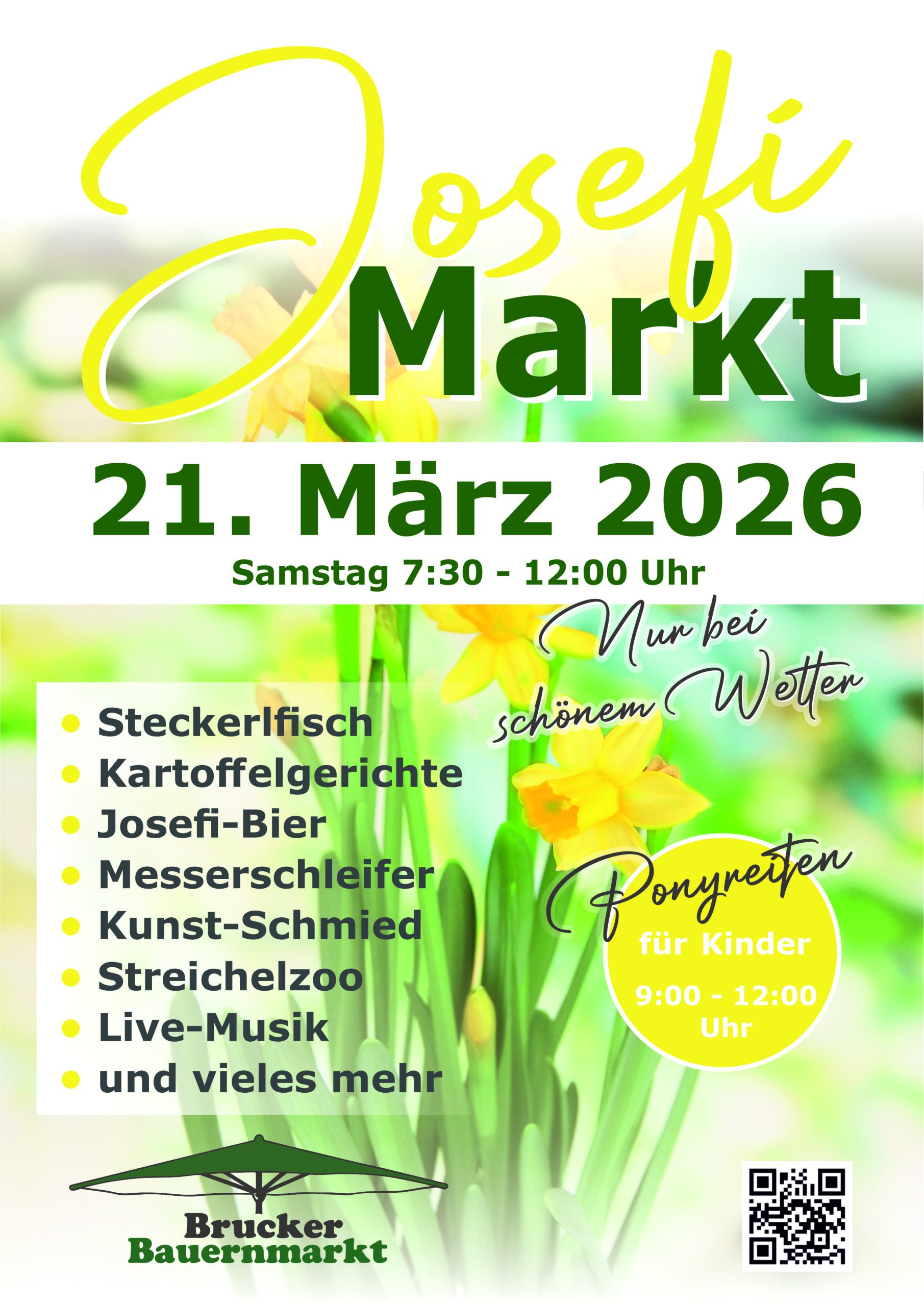 Wir laden Sie und Ihre Familie herzlich zu unserem traditionellen Josefifest am Brucker Bauernmarkt ein! Freuen Sie sich auf einen Tag voller regionaler Köstlichkeiten, geselliger Begegnungen und stimmungsvoller Unterhaltung. Unsere geplanten Aktionen finden nur bei schönem Wetter statt – so können wir gemeinsam unter freiem Himmel feiern und genießen. Wir freuen uns auf Ihr Kommen und einen unvergesslichen Tag mit Ihnen!